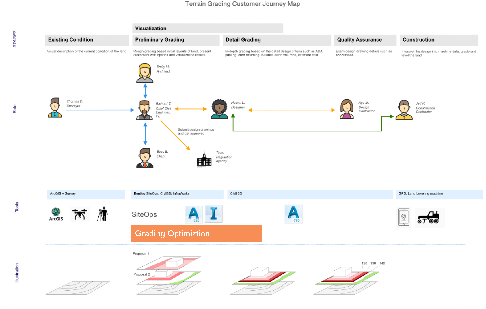As Grading Optimization as a product work with other design software in the company, data are exchanged between the design tools and this optimization platform. Diagrams are produced to illustrate the data flow between different tools, how certain data are reshaped after the optimization, and how might we indicate those changes.