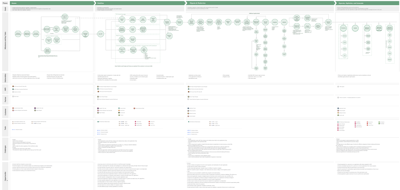 Customer's journey are mapped into swim lane labeled with goals, tasks, deliverables,personas for AWS/partner/customer, tools, challenges and opportunities. Journey map provides team with holistic overview of the process to highlight painpoints and challenge. Ideas spring from journey map, and user stories were made afterwards.